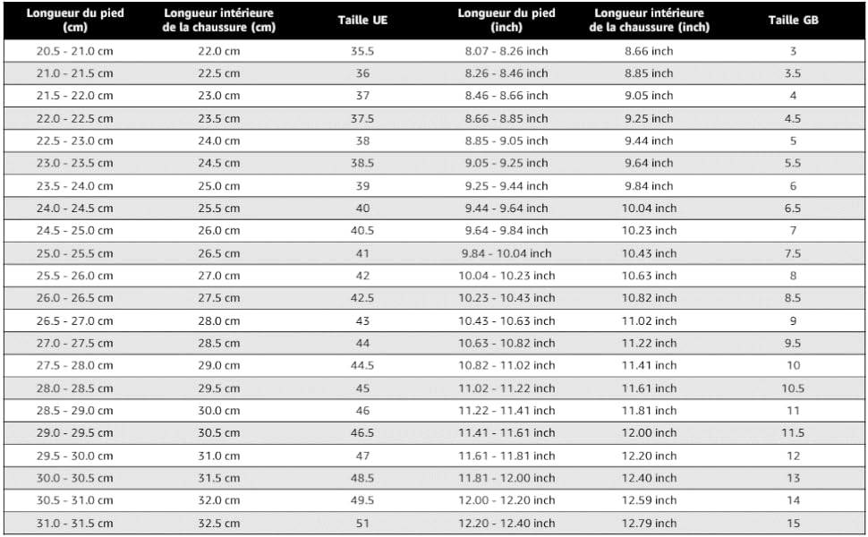 Les pointures des chaussures ne sont pas standardisées. Chaque fabricant de chaussures utilise différentes mesures en termes de hauteur du cou-de-pied, de forme des orteils et de largeur du pied. Cependant, la base de votre propre pointure est toujours la longueur de vos pieds. Vous devez donc toujours déterminer la longueur de votre pied avant d’acheter afin de choisir la bonne chaussure.